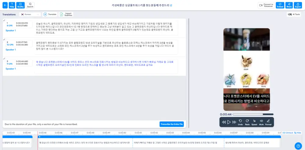 몇가지 단어가 뭉개지는 소리에 대해서는 단어를 잘 파악하지 못했습니다. 예를들어 “스파이시함”을 “스파이션만”이라고 하거나 “기린”을 “길인”이라고 추출한 점은 앞뒤 문맥을 파악하지 않으면 전혀 다른 단어로 인식할 수 있기 때문에 문제가 있어 보였습니다. 그러나 전반적이 내용을 파악하기에는 전혀 문제가 없었습니다. 텍스트를 추출하는 속도는 위에 소개한 Maesta ai와 큰 차이는 없어 보였습니다.