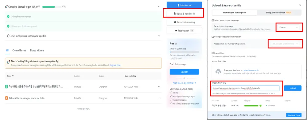 다음은 Notta라는 사이트입니다. 회의나 인터뷰 시 오디오나 비디오를 캡쳐해 텍스트를 추출하고 원하는 언어로 번역, AI노트 등이 주요 기능인 사이트입니다. Notta는 회원가입 후 무료로 사용할 수 있었고 120분 영상을 무료로 텍스트 추출할 수 있었습니다. 사용 방법은 어렵지 않았습니다.