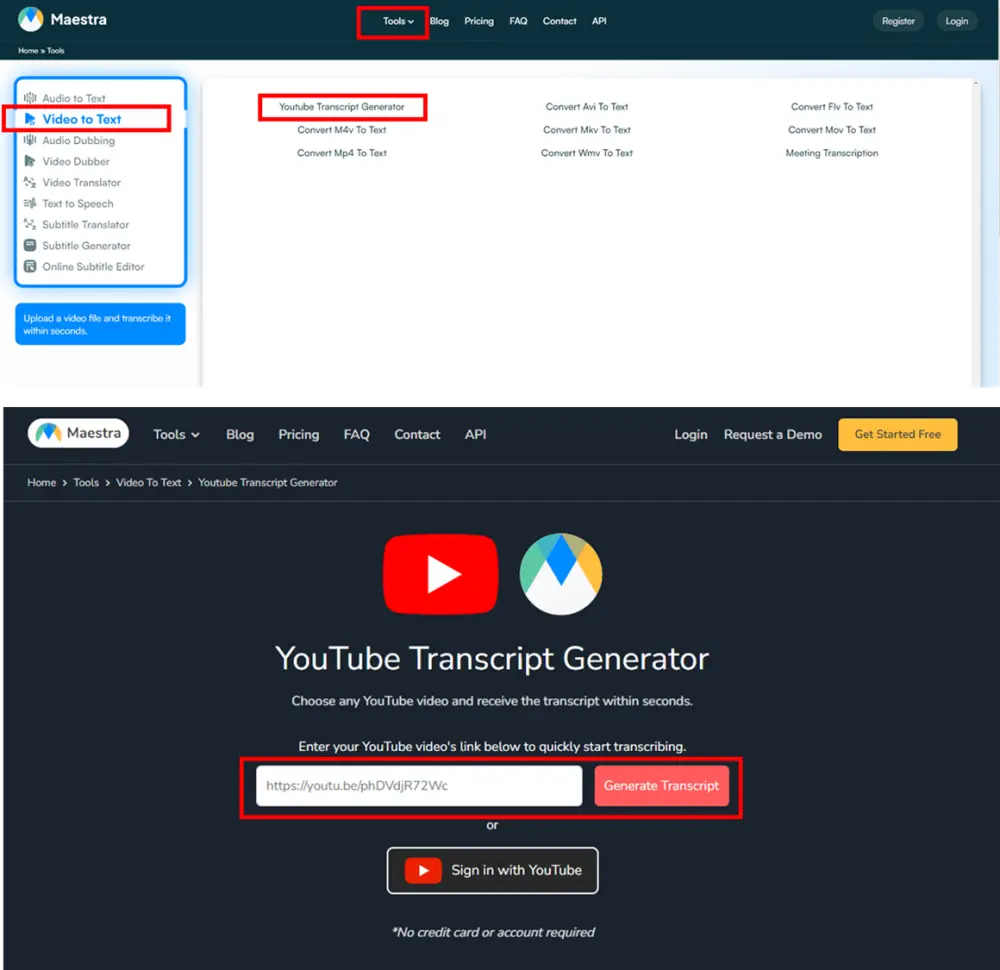 YouTube 대본 생성기를 대본 변환기로 사용하고 YouTube를 대본 변환기로 사용하세요. 비디오를 텍스트로 전사합니다.