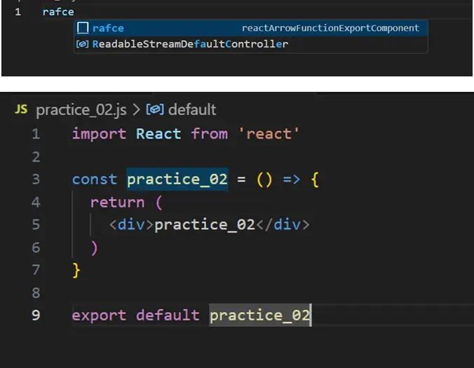해당 프로그램을 설치 후 코드 편집기에서 특정 스니펫의 접두어를 입력하고 Tab 키를 누르면 해당 스니펫이 자동으로 확장됩니다. 예를 들어 rafce를 입력 후 Tab키를 눌러주면 아래 React Arrow Function Component with export 코드가 자동으로 작성됩니다.