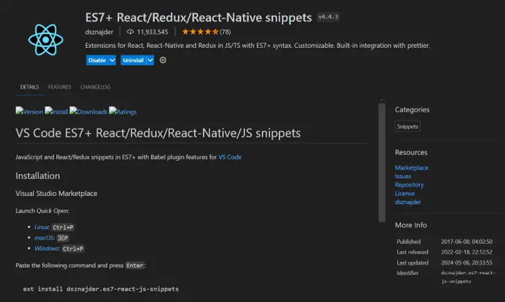 다섯 번째 추천 프로그램 ES7+ React/Redux/React-Native snippets