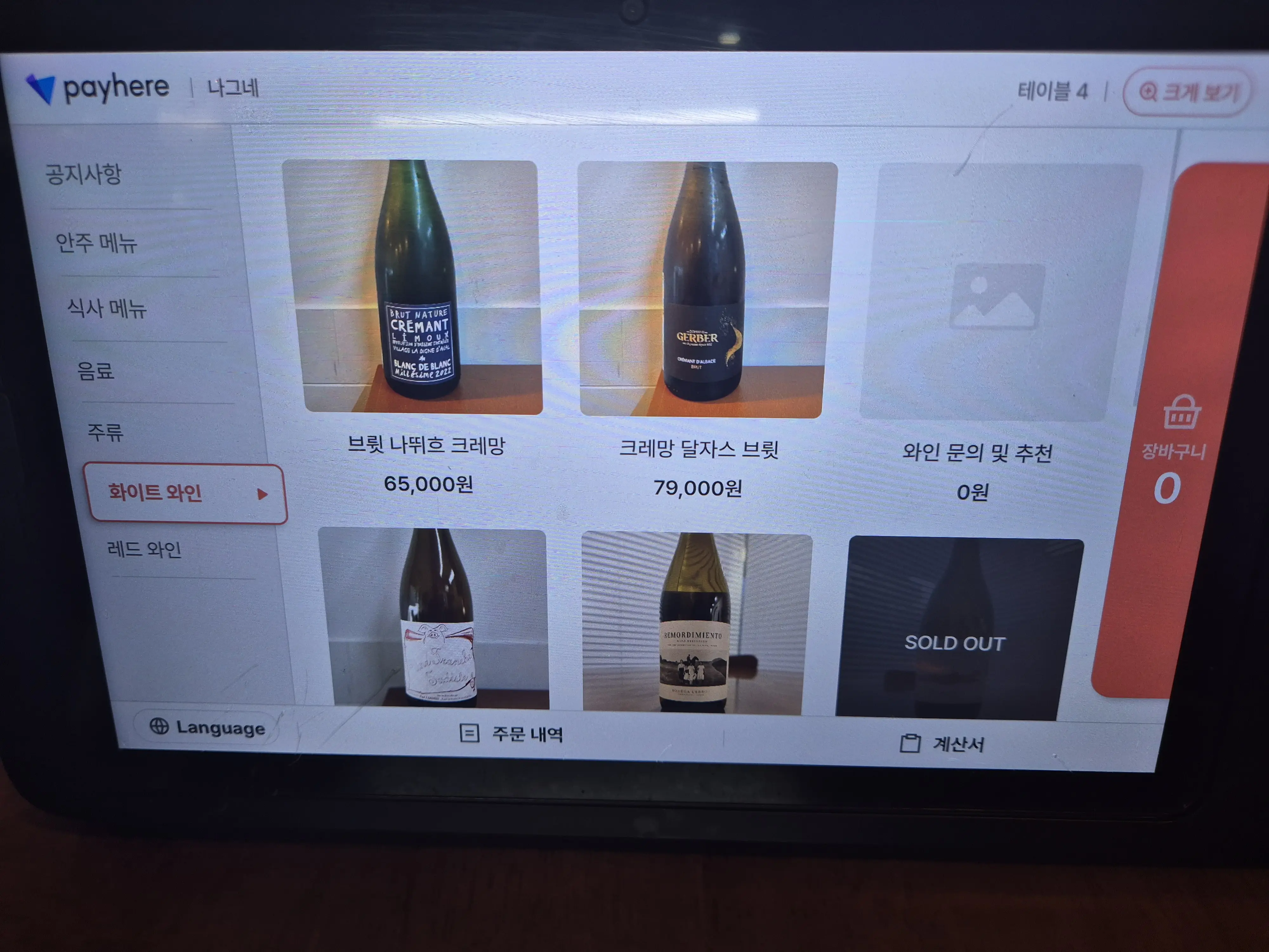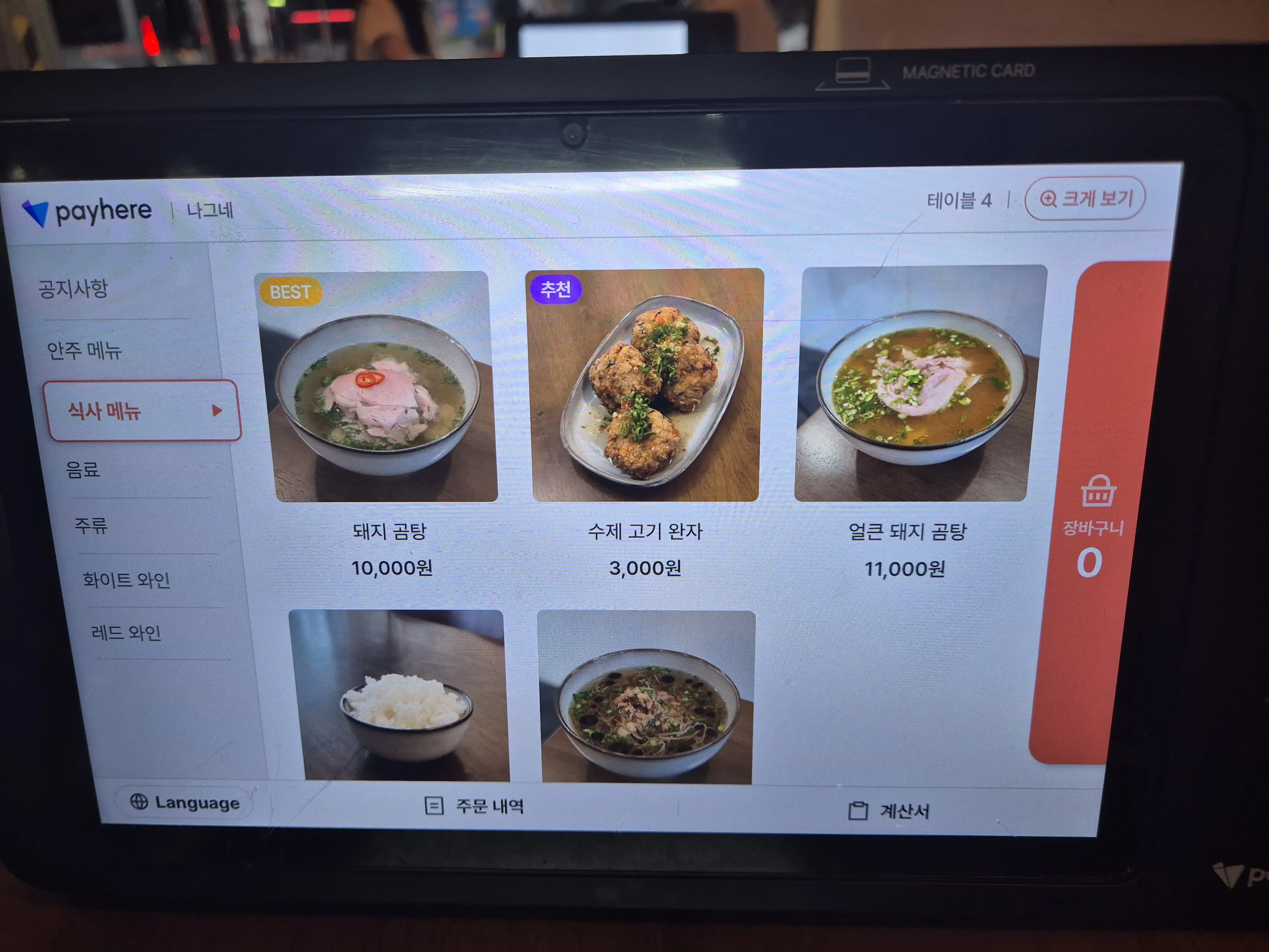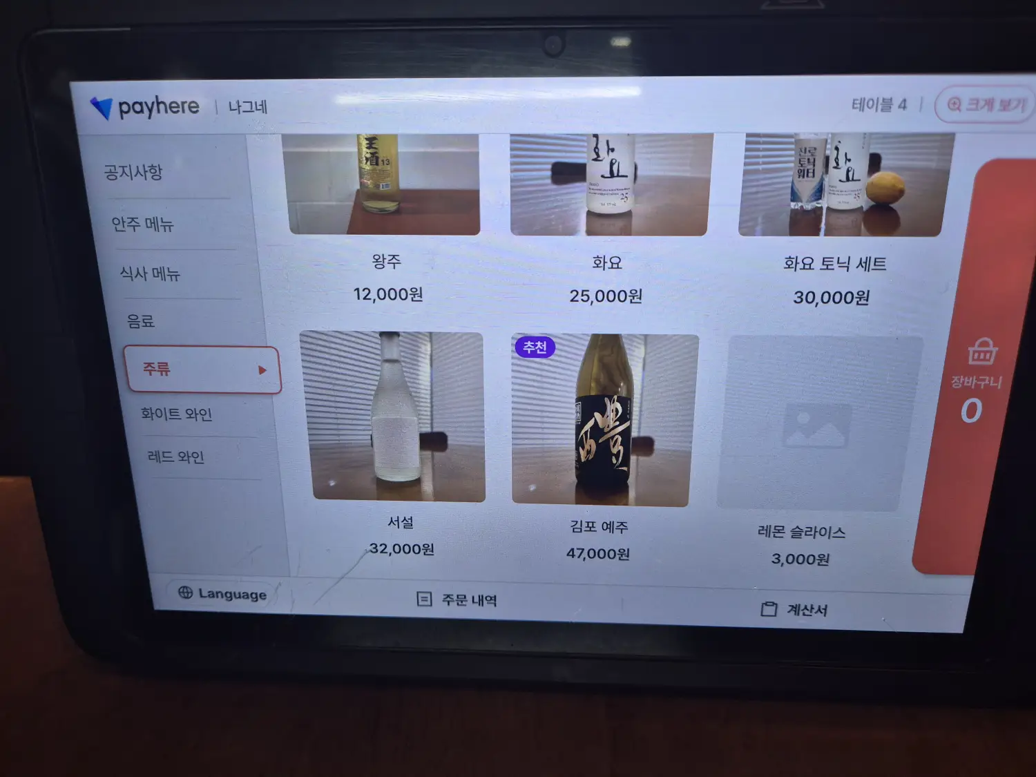 주문은 각 테이블에 비치된 키오스크를 통해 할 수 있습니다. 대표 메뉴는 곰탕이지만, 간단히 술 한잔 하기 좋은 요리들도 준비되어 있습니다. 소주는 참이슬과 새로, 그리고 전통주로는 왕주·서설·김포 예주 등이 있었고, 와인 종류도 다양하게 구비되어 있었습니다.