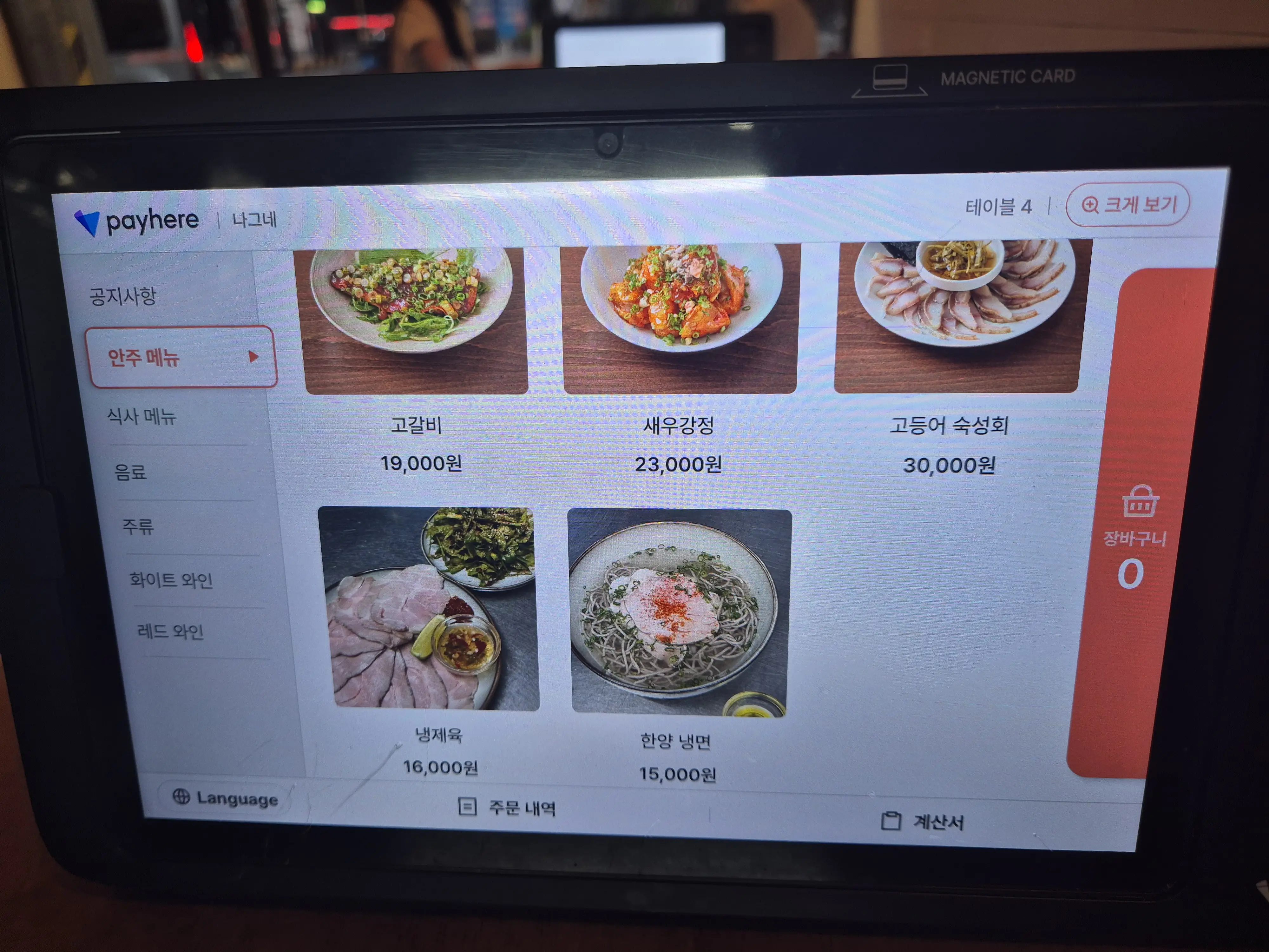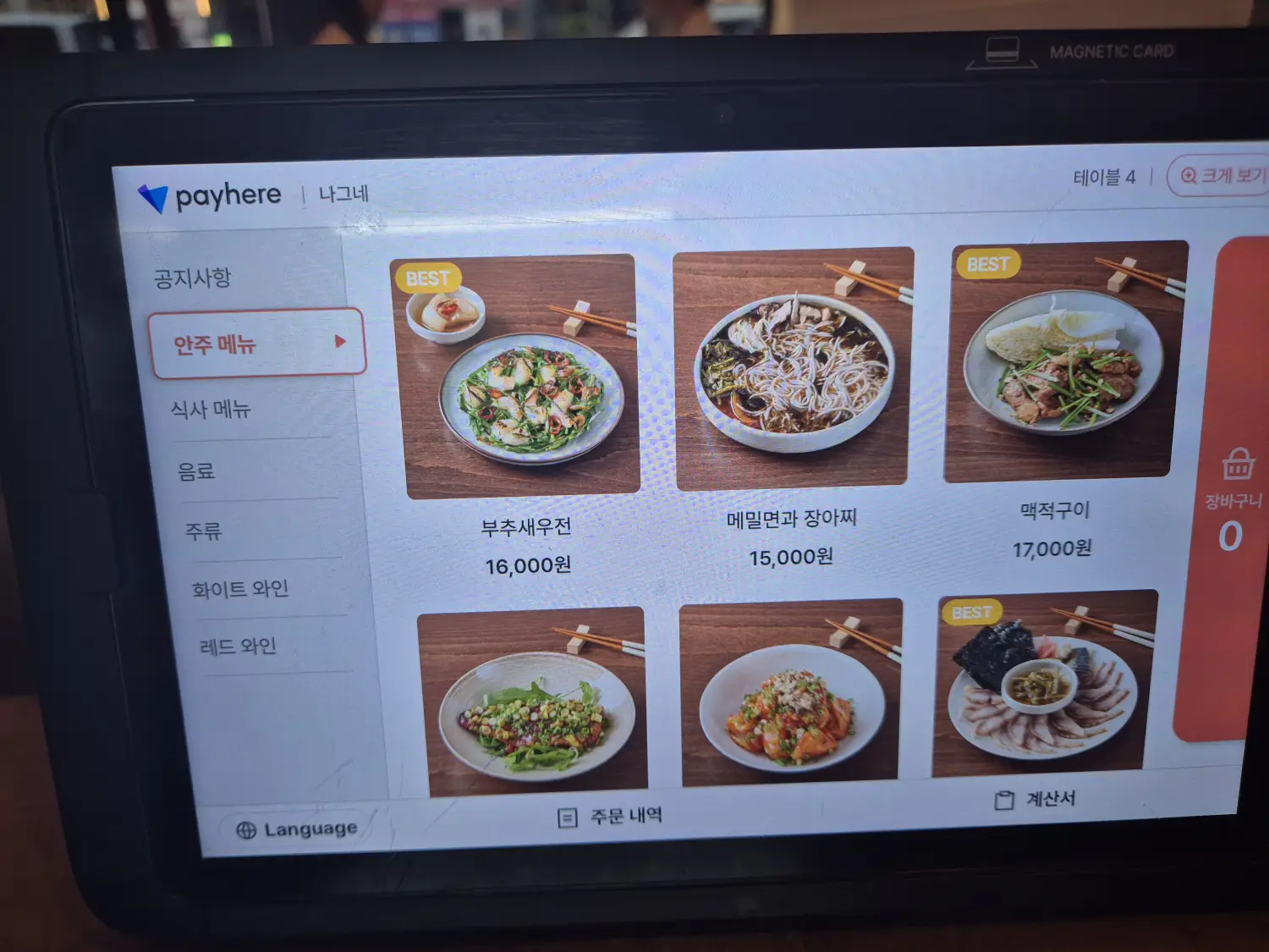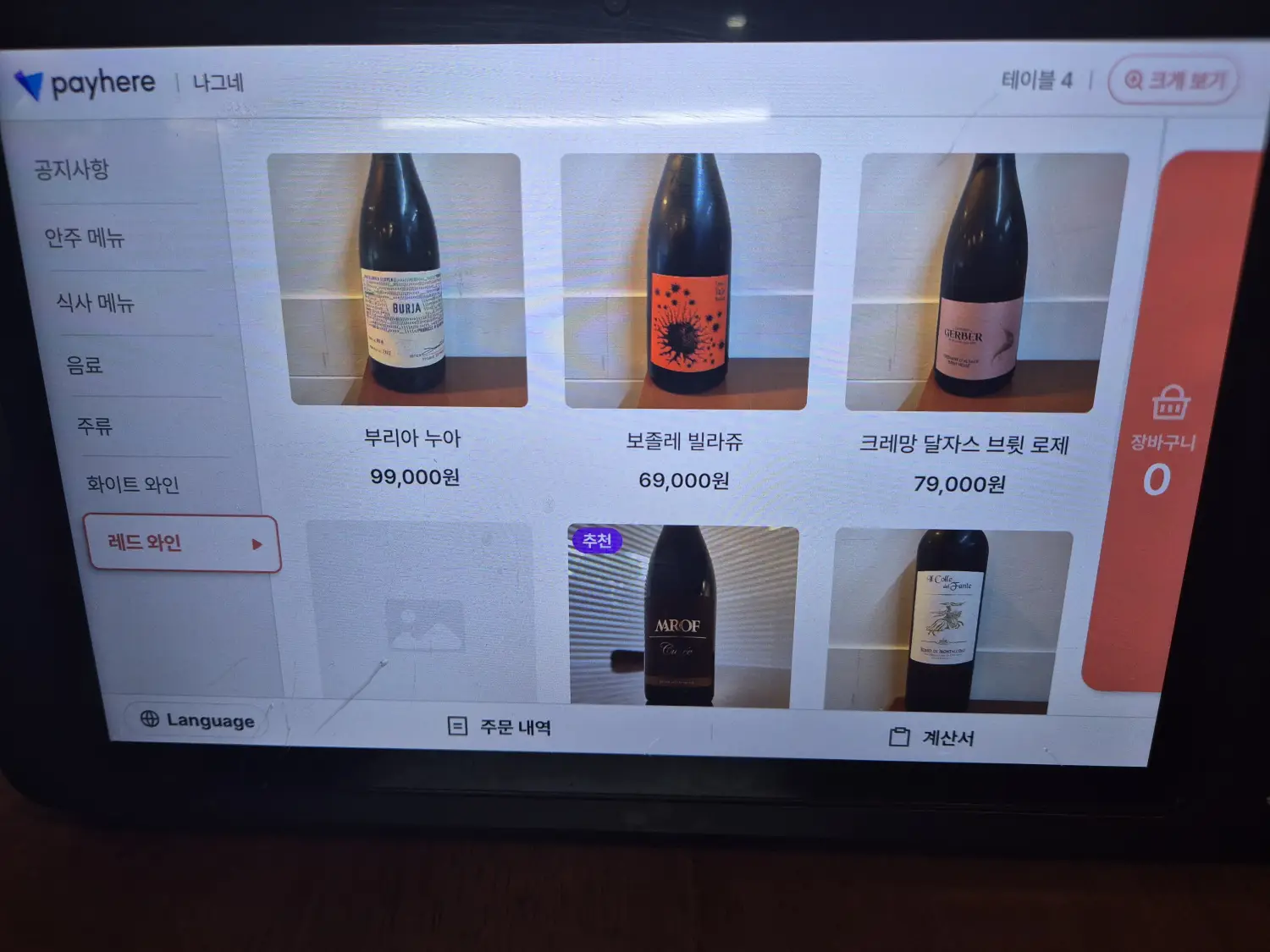 주문은 각 테이블에 비치된 키오스크를 통해 할 수 있습니다. 대표 메뉴는 곰탕이지만, 간단히 술 한잔 하기 좋은 요리들도 준비되어 있습니다. 소주는 참이슬과 새로, 그리고 전통주로는 왕주·서설·김포 예주 등이 있었고, 와인 종류도 다양하게 구비되어 있었습니다.