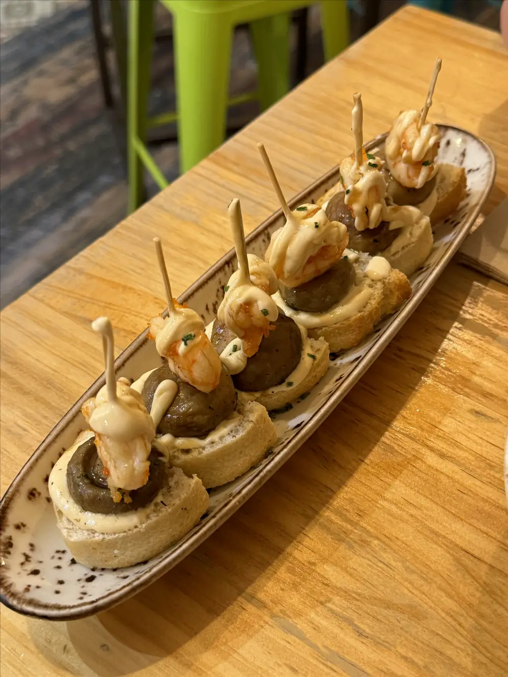 다음으로 새우 핀쵸스는 정말 맛있었습니다. 새콤 달달한 마요네즈 소스에 짭짤한 맛이 적절하게 섞이고 바삭한 빵과 부드러운 버섯, 나름 쫄깃한 새우가 너무나 어울리는 조합이었습니다. 이 음식을 위해서라도 한번 더 방문하고 싶은 곳이었습니다. 스페인에 도착한 당일이다보니 급하게 찾아 조금은 대충 들어갔던 곳이었는데 후기도 좋았고 너무 만족했던 식당이었습니다. 조금 더 찾아보니 수제 치킨 너겟과 이베리코 스테이크, 리조토까지 대부분 음식이 가성비 있고 맛있는 것 같았습니다. 아토차역을 주변을 구경하신다면 꼭 한번 들려 보시기를 추천드립니다.