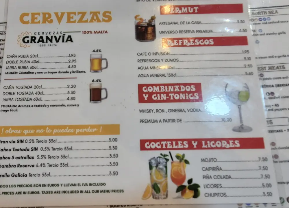 오기 전에 간단히 스페인 여행에 대해 찾아보니 스페인같은 경우 보통 주류 혹은 음료수를 1잔 씩 주문하고 메인 메뉴를 주문하는 것이라고 봤기 때문에 주류 메뉴판 먼저 확인하고 술을 주문했습니다. 술은 처음 도착해서 목이 너무 마르기도 했고 스페인 맥주를 가장 먼저 마셔보고 싶어 생맥주 40cl을 주문했고 베르무트도 유명하다고 들어 베르무트에 쓰여있는 가장 첫 번째 메뉴를 주문했습니다.