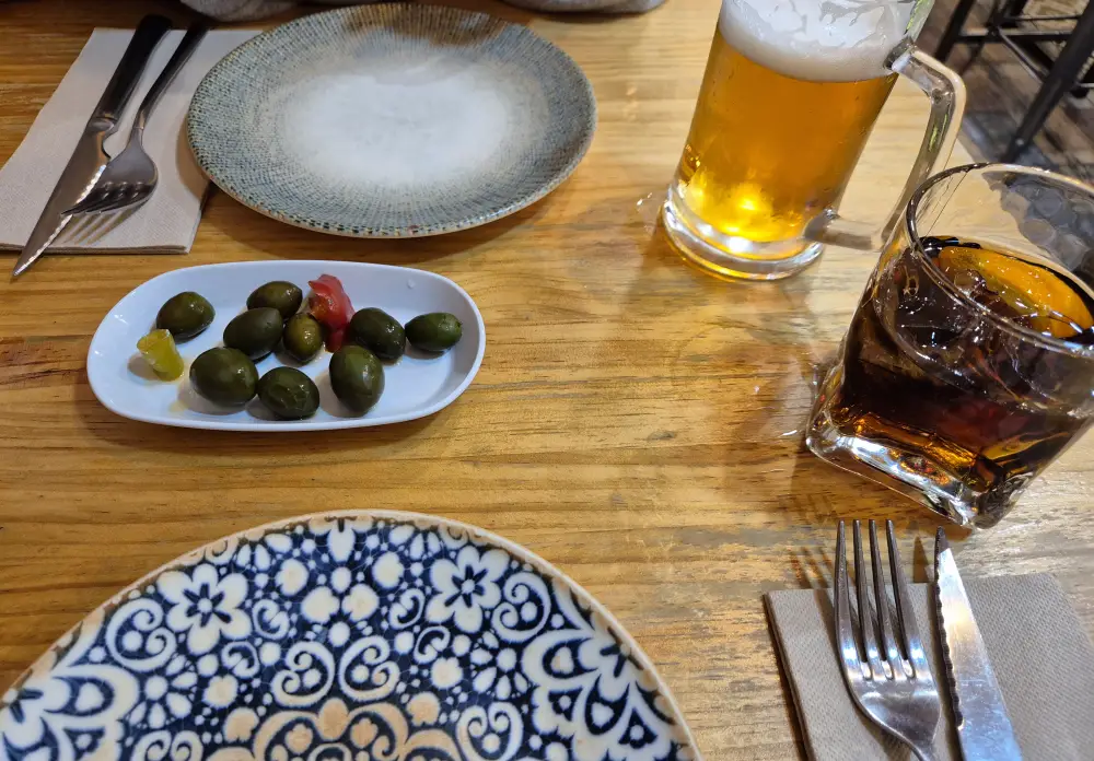 주문한지 얼마 안있어 접시와 젖가락, 포크를 가져다 주셨습니다. 첫 식당이라서 그런지 접시 마저 뭔가 스페인 스럽다는 느낌이 들기도 했고 좋았습니다. 그리고 올리브와 함께 술을 갖다 주셨습니다. 붉은색을 띄는 베르무트는 처음 마셔 봤는데 독특하면서도 입맛에 맞았습니다. 찾아보니 허브와 향신료로 맛을 낸 강화 와인이라고 하는데 생각해보다 달달하며서도 향이 강렬했습니다. 나름 맛있었고 마실만 했습니다. 맥주는 너무 시원하고 맛있었습니다. 특별히 어떤 점때문에 더 맛있다라고 꼽기에는 어려웠지만 스페인 맥주가 맛있다는 것은 들었는데 정말 맛있었습니다.